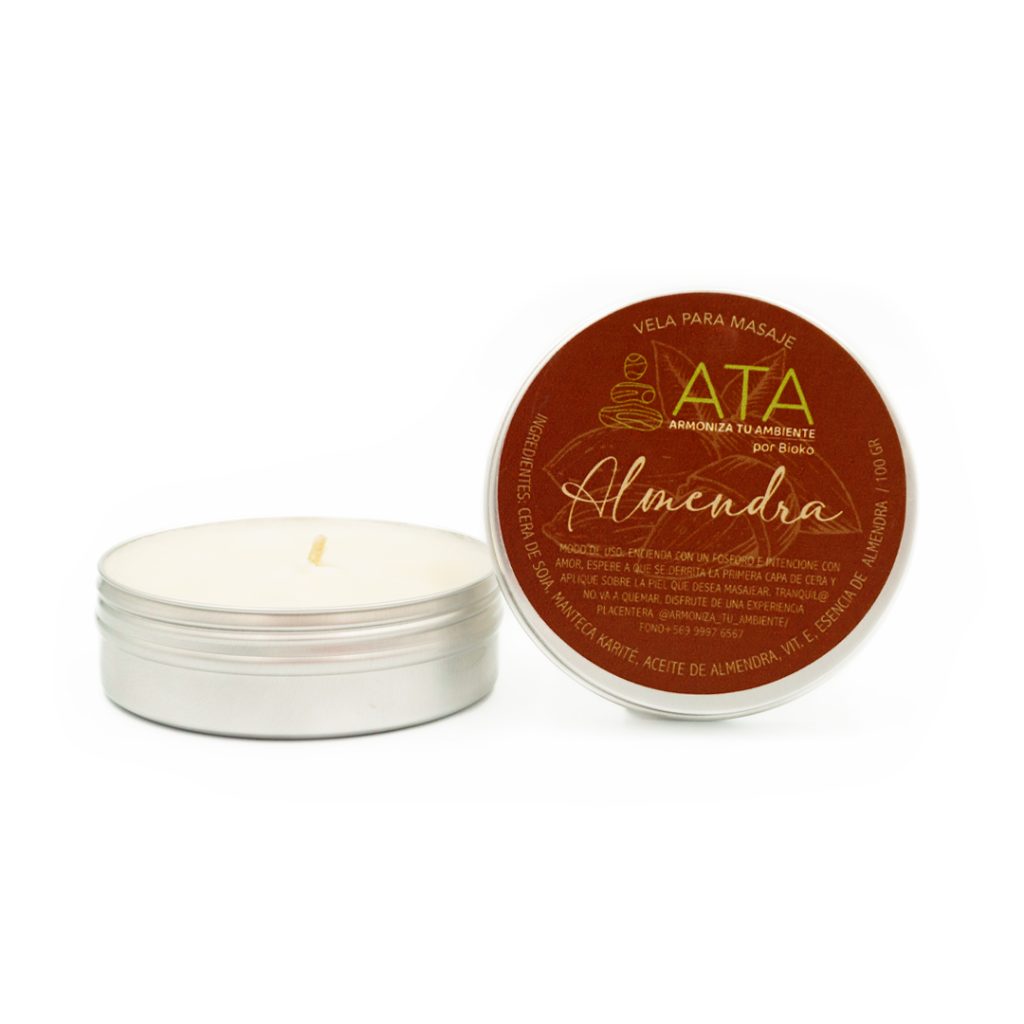 Vela para masaje corporal, elaborada con cera de soja, manteca de karité, aceite de almendra dulce, vit e y esencia 100% pura. La calidad de sus materias primas otorga un masaje natural, a temperatura, de textura ligera, suave y emoliente y sin dejar la piel oleosa, puesto que, al ser sus ingredientes de origen natural, nuestra piel tiene la capacidad de absorber y nutrirse.
